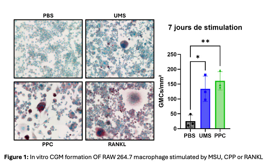Results: In vitro, MSU and CPP crystals induced the fusion of RAW 264.7 macrophages and the formation of GMCs from 4 days of stimulation. The number of GMCs increased over time to reach a plateau after 7 days of stimulation. The kinetics of GMCs formation were equivalent to those observed under RANKL stimulation. But the GMCs induced by RANKL were larger than those induced by the crystals. These GMCs expressed Tartrate-Resistant Acid Phosphatase (TRAP) and had an actin ring similar to that seen in osteoclasts. Histological analysis of the tophi showed that CGMs had high expression of TRAP and cathepsin K. The CGMs also had a ring-organized expression of integrin- β3. In vivo in mice, subcutaneous injection of MSU and CPP induced a positive TRAP gigantocellular reaction similar to that observed in tophi. Spatial transcriptomic analysis confirmed that GMCs surrounding tophi strongly expressed osteoclastic markers (ACP5, CTSK, MMP9, SPP1) and lysosomal storage proteins (CTSK, CTSB, ATP6AP2, ATP6V1B2).