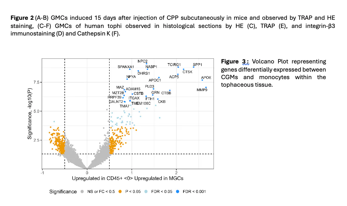 Methods: In vitro, the ability of synthetic MSU and CPP crystals to induce GMCs formation was compared to that of RANKL using the murine macrophage line (RAW 264.7). In vivo, the crystals were injected subcutaneously and the formation of CGMs studied 15 days later. Tophi collected from gout patients were included and then studied by HE, TRAP staining and cathepsin K and integrin-β3 immunostaining. The spatial transcriptome was performed via Nanostring's GeoMx kit on histological tophi section.