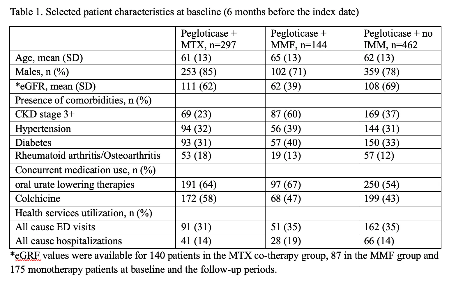 Methods: This is a longitudinal analysis using the Optum Clinformatics® DataMart®, 2016-2024. The study participants included new users of pegloticase; the first pegloticase infusion defined the index date. Based on the presence of IMM treatment ±90 days from the index date, we defined three exposure groups: MTX co-therapy group, MMF group and pegloticase monotherapy (IMM nonusers). We described pegloticase duration of use, patterns of sUA values and estimated Glomerular Filtration Rate (eGFR). Analyses were stratified by baseline eGFR (60+ vs. <60 ml/min/1.73m2).