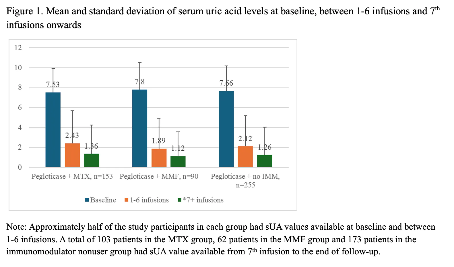 Conclusion: 49% of pegloticase patients with uncontrolled gout were treated with immunomodulating co-therapy, among which MMF was 33% of IMM use, with most patients going on MMF having advanced CKD. Pegloticase duration, effectiveness in terms of sUA reduction and eGFR stability in the MMF group were similar to the MTX group. The co-therapy of MMF and pegloticase may be an option for patients with pre-existing renal impairment.