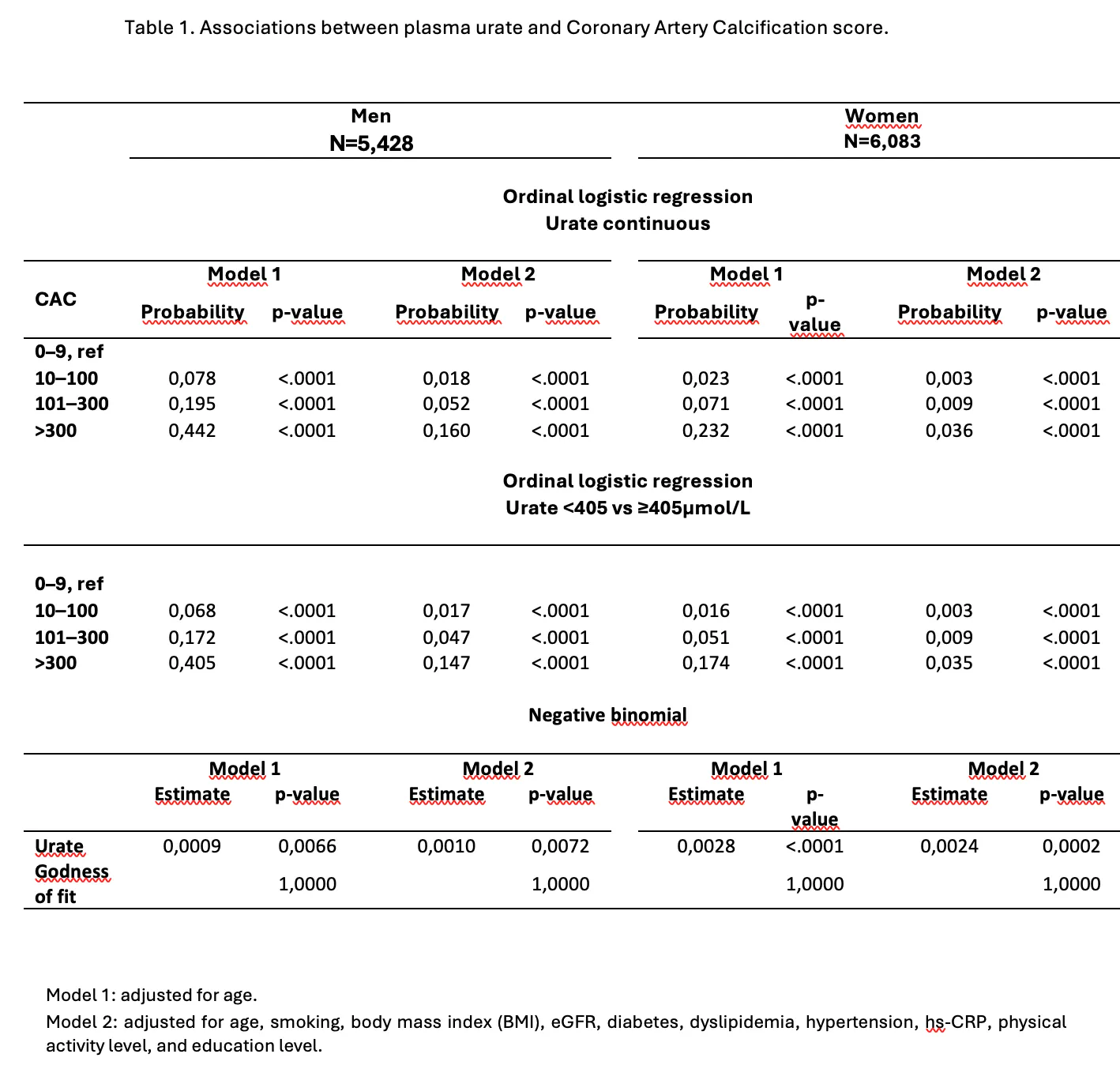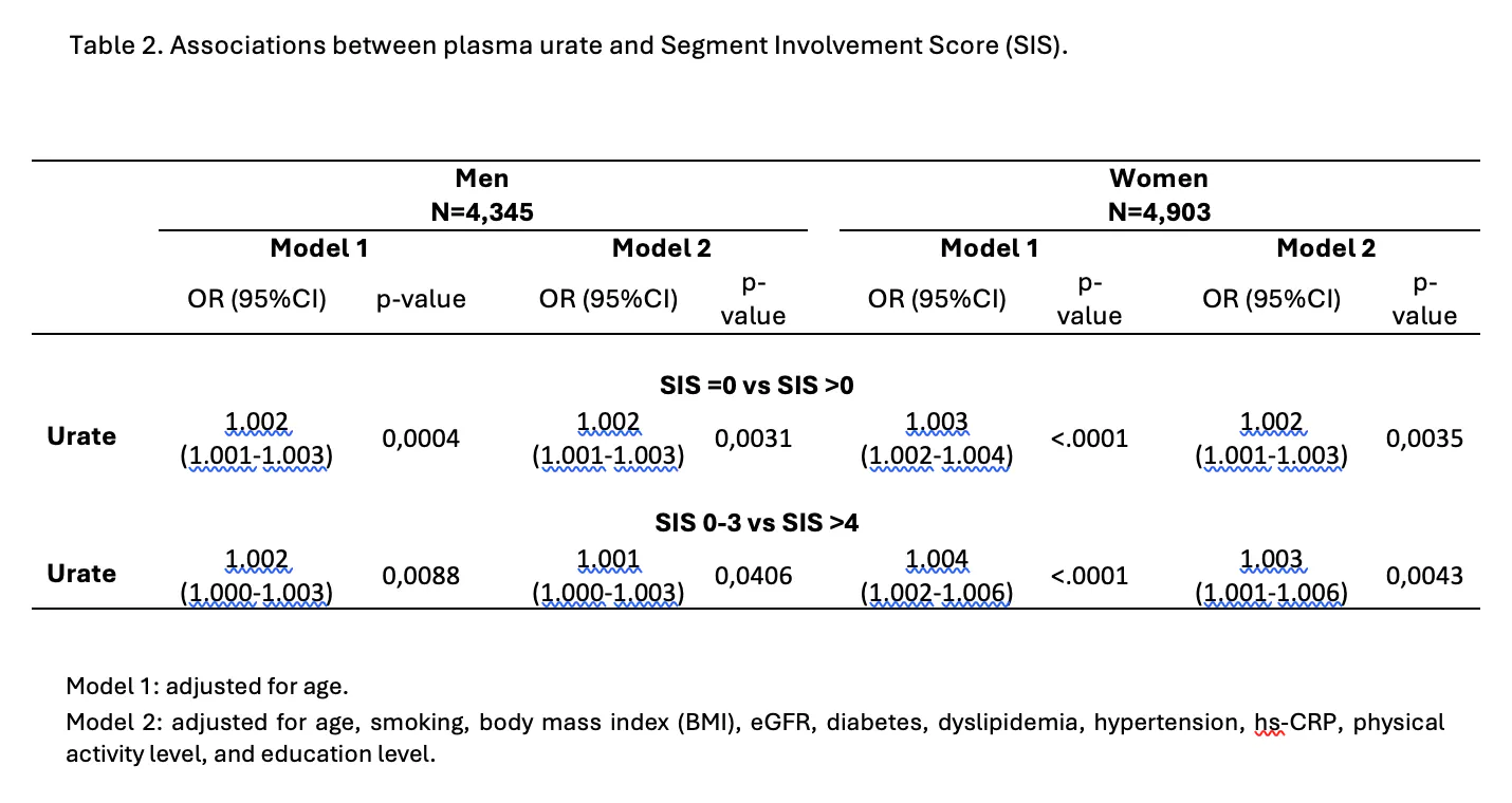 Results: For the CACS analyses, 5,428 men and 6,083 women were included. In both men and women, plasma urate was associated with a significantly increased probability of having a higher CACS (CACS 10-100, 101-300, >300), compared to the reference group (CACS 0–9). These associations were consistent when urate was modeled as a continuous and as a dichotomous variable (urate <405 vs ≥405) and remained statistically significant even in the fully adjusted models (Table 1). For the SIS analyses, 4,345 men and 4,903 women were included. Similarly, in both men and women, urate was associated with a significantly increased probability of having SIS >0 and SIS ≥4 compared to the reference groups (SIS=0 and SIS 0-3, respectively). These associations remained significant even in the fully adjusted models (Table 2).