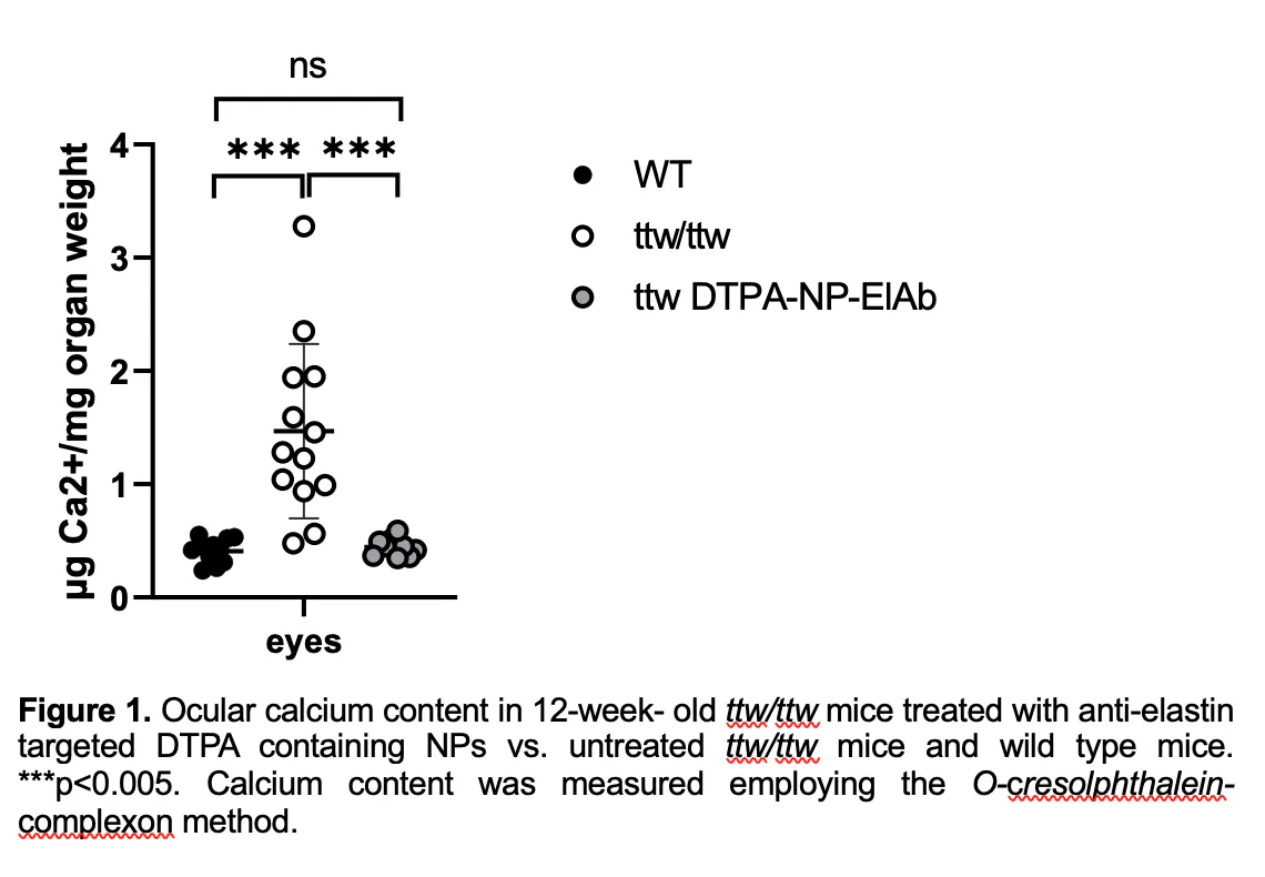 Results: Calcified sub-RPE deposits were evident at 9 weeks of age in ttw/ttw mice fed a high-phosphate diet, and calcifications were more pronounced at 12 weeks of age. EDS confirmed the presence of calcium phosphate-rich mineral phases. Ocular calcifications were absent in wild type (WT) mice. Ttw/ttw mice with sub-RPE calcifications displayed decreased amplitudes of ERG a- and b-waves compared to control WT mice. Ocular calcium content in ttw/ttw mice treated with systemically administered NPs targeted to BM was equal to ocular calcium content in WT mice (Figure 1), suggesting resolution of sub-RPE calcifications in ttw/ttw mice.
