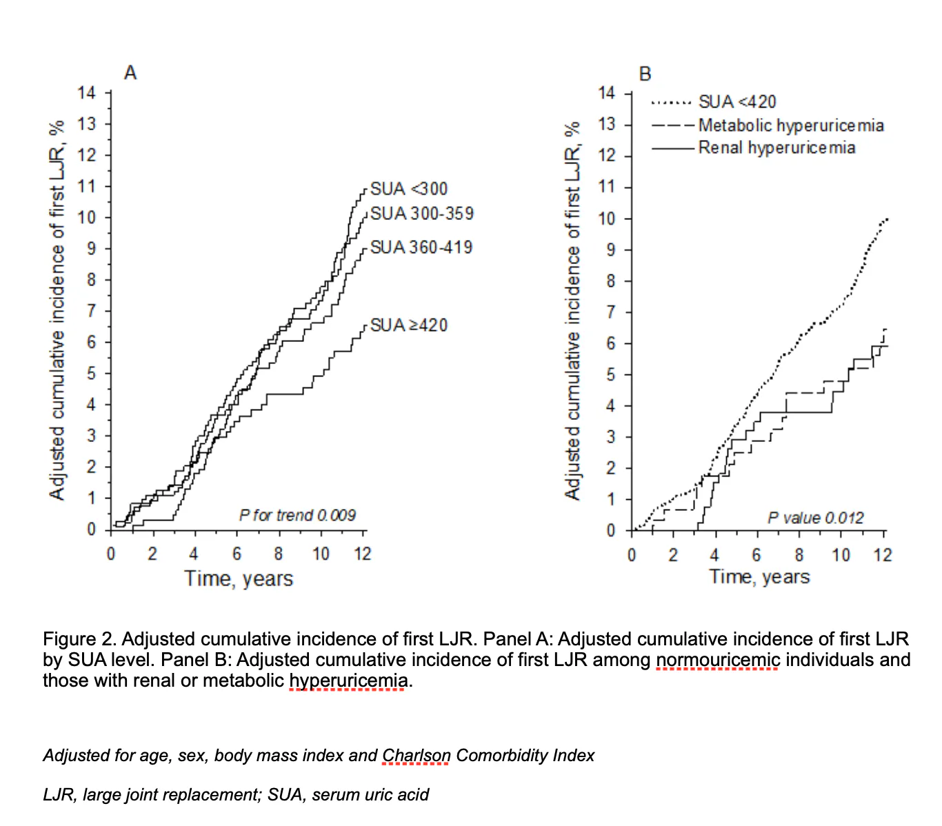 Conclusions: In this population-based cohort, higher SUA levels were associated with a lower likelihood of LJR during 12.7 years of follow-up, a finding not previously reported. No substantial difference in LJR risk was observed between individuals with metabolic and renal hyperuricemia. Further studies are needed to determine whether uric acid exerts a protective effect on cartilage in large joints or whether the observed association reflects residual confounding. Replication in independent cohorts and mechanistic studies examining the role of uric acid in cartilage health are warranted.