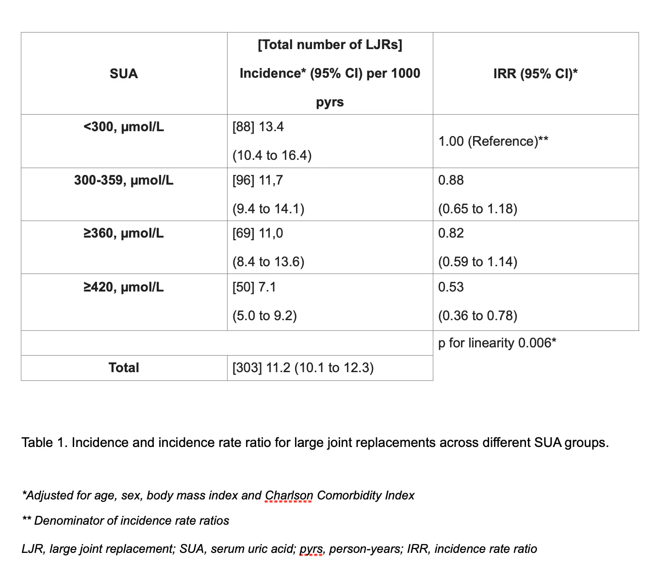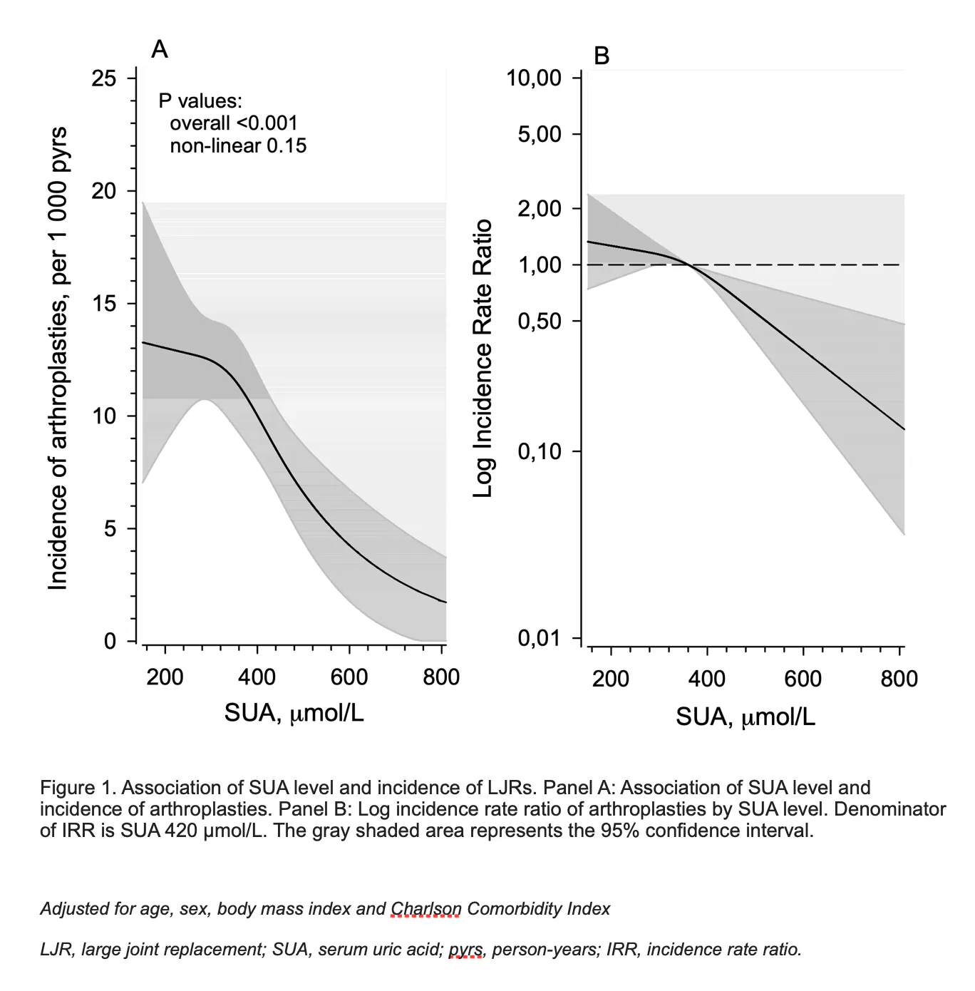 Background: Serum uric acid (SUA) has been associated with a range of health conditions, including osteoarthritis (OA), although previous findings have been inconsistent [1]. Evidence on the relationship between SUA and OA in large joints is particularly limited, and the potential link between SUA levels in persons without gout and the need for large joint replacements (LJRs) has not been previously explored. This study aimed to investigate the association between SUA levels and the incidence of LJRs in a population-based cohort.