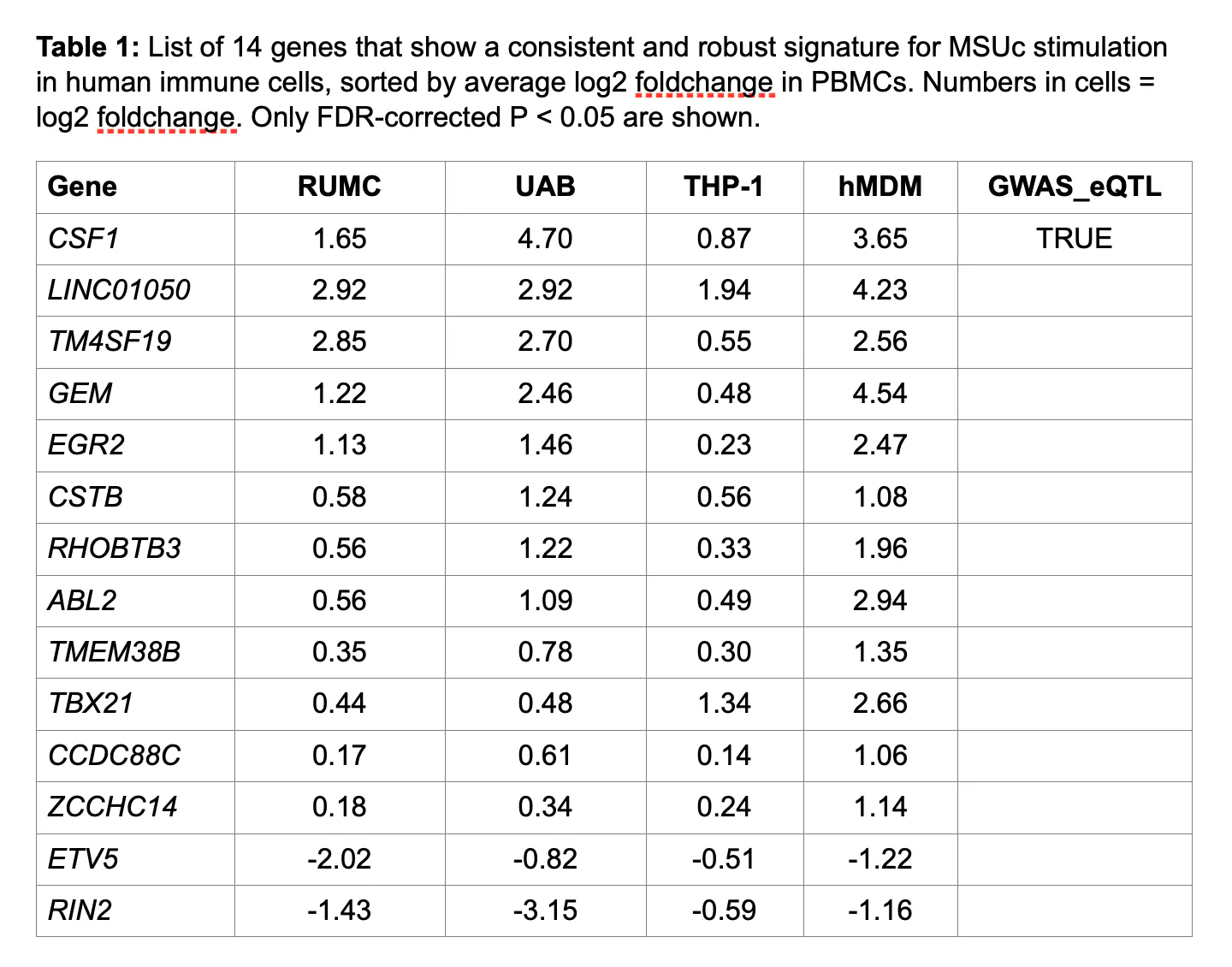 Findings: We validated a clear transcriptomic signature associated with MSUc stimulation, with each dataset exhibiting between 1,974 and 4,779 differentially expressed genes in the MSUc condition compared to control samples. In total, 1,039 genes were significant and directionally consistent in both PBMC datasets. Of these, 55 were also significant in the THP-1 and hMDM datasets with consistent directionality, with 41 of these showing an opposite effect with inflammasome inhibition in THP-1 cells, and 14 of these showing either no effect or an opposite effect with LPS in PBMCs (Figure 1 & Table 1). Of these 14 genes, CSF1 was the only gene also implicated by the gout GWAS (Major et al., 2024).