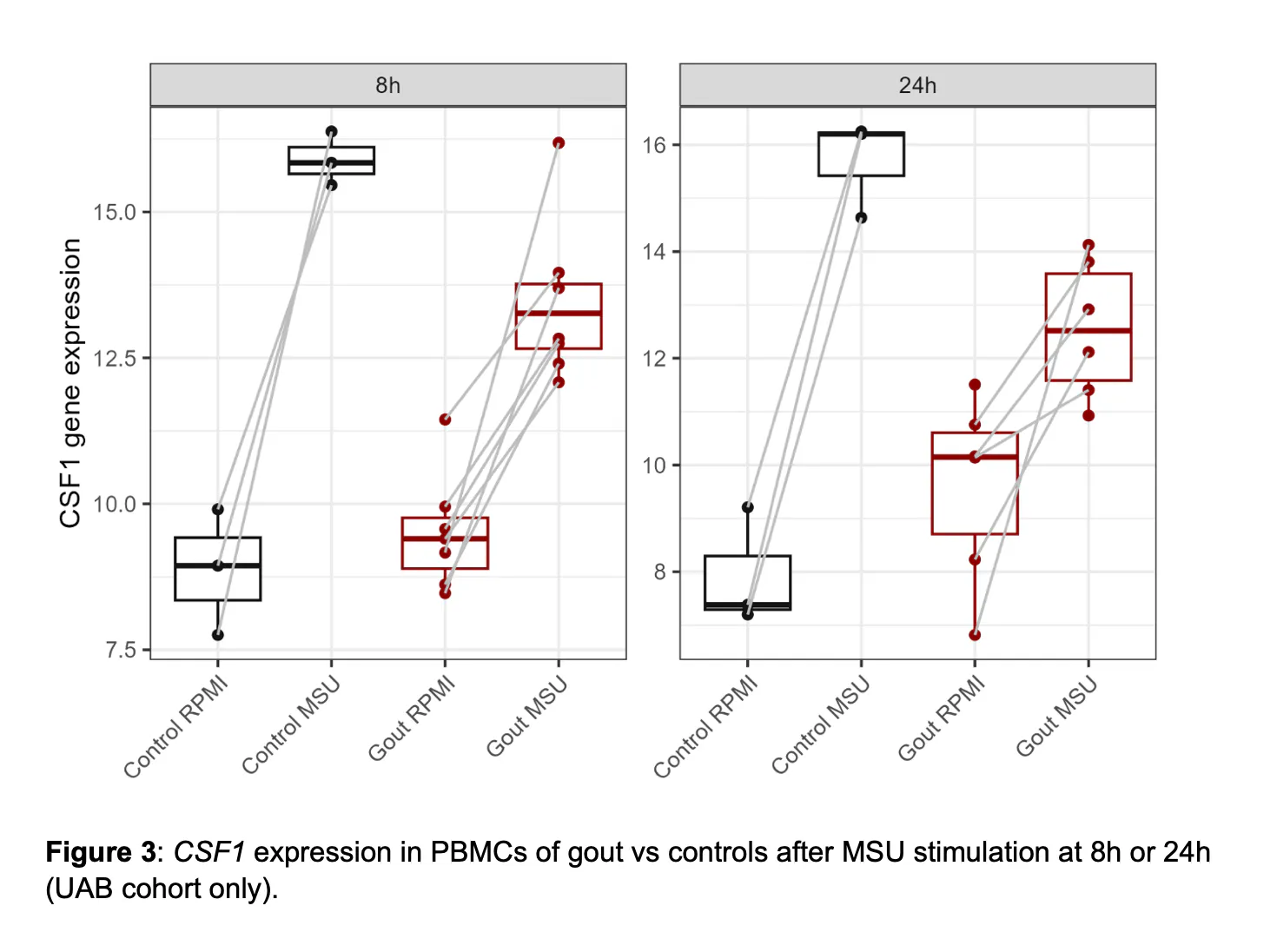 Significance: This study highlights genes that are extremely likely to be involved in the inflammatory mechanism of a gout flare, with CSF1 being strongly implicated. CSF1 encodes the M-CSF protein, which is involved in the differentiation of monocytes to macrophages. The gout GWAS risk allele (rs2938616-T) results in decreased expression of CSF1 in primary fibroblasts, while MSUc stimulation consistently increases the expression of this gene in human immune cells. This suggests that those individuals with the gout-risk allele would mount an insufficient CSF1 response to MSUc deposition in the joint, leading to an increased risk of gout. In line with this, the six individuals with gout in the UAB cohort showed a reduced CSF1 response to MSUc compared to the three controls in this cohort, though this needs validation in a larger cohort (Figure 2). This finding suggests that elevated levels of CSF1 are protective of gout, perhaps driving appropriate monocyte differentiation that controls the response to MSUc.